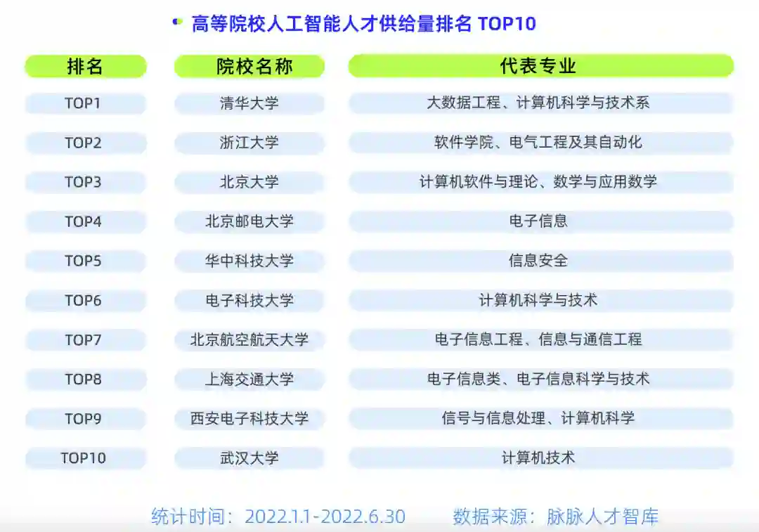 其次是浙江大学、北京大学、北京邮电大学和华中科技大学,主要代表专业为计算机科学与技术、电子信息、大数据工程、信息与通信工程等。