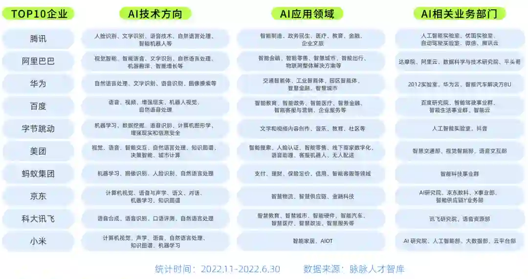 其次,百度、字节、美团、蚂蚁、京东、小米。值得一提的是,科大讯飞在吸引AI人才力度上位列第9。