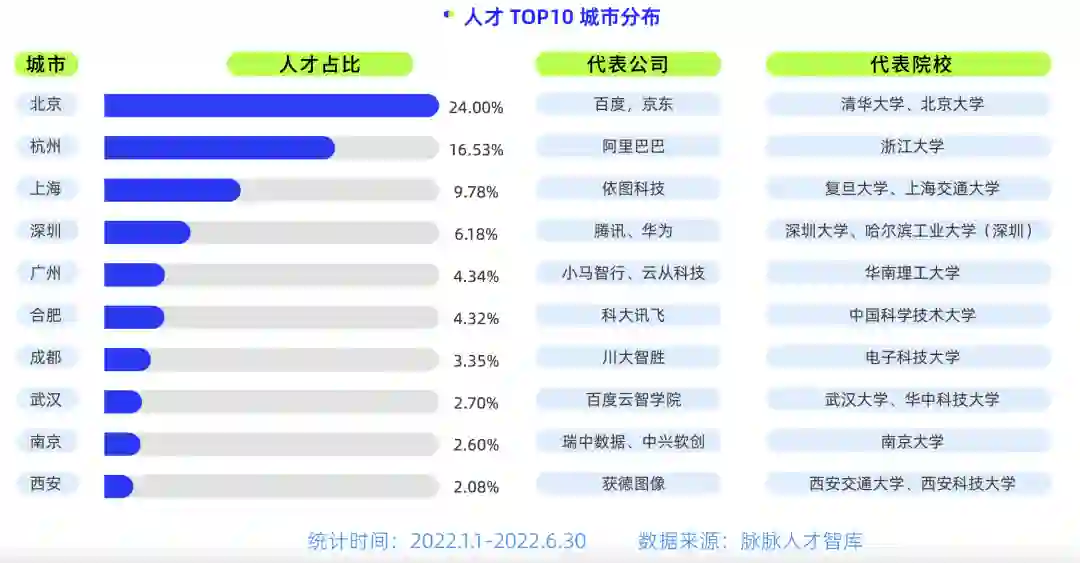 再来看人才分布TOP10城市,24%的人工智能人才分布于北京,位居全国第一。