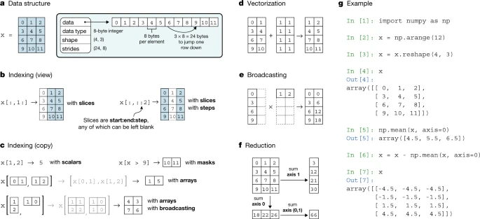 用户使用「indexing」索引来访问子数组或单个元素、「operators」如,+ 、-和 × 用于向量化操作、「@」用于矩阵乘法,以及array-aware函数与 NumPy 数组进行交互;。