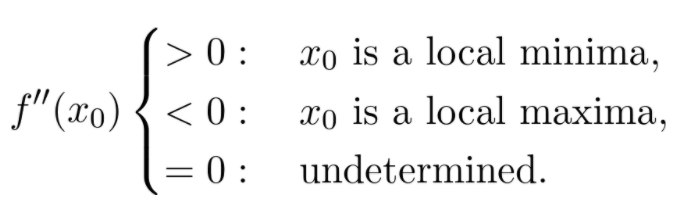 微分可以用来优化函数:导数在局部极大值和极小值处为零。(也有例外,例如:f(x) = x³,x=0),导数为零的点称为临界点。临界点是最小值还是最大值可以通过查看二阶导数来确定:
