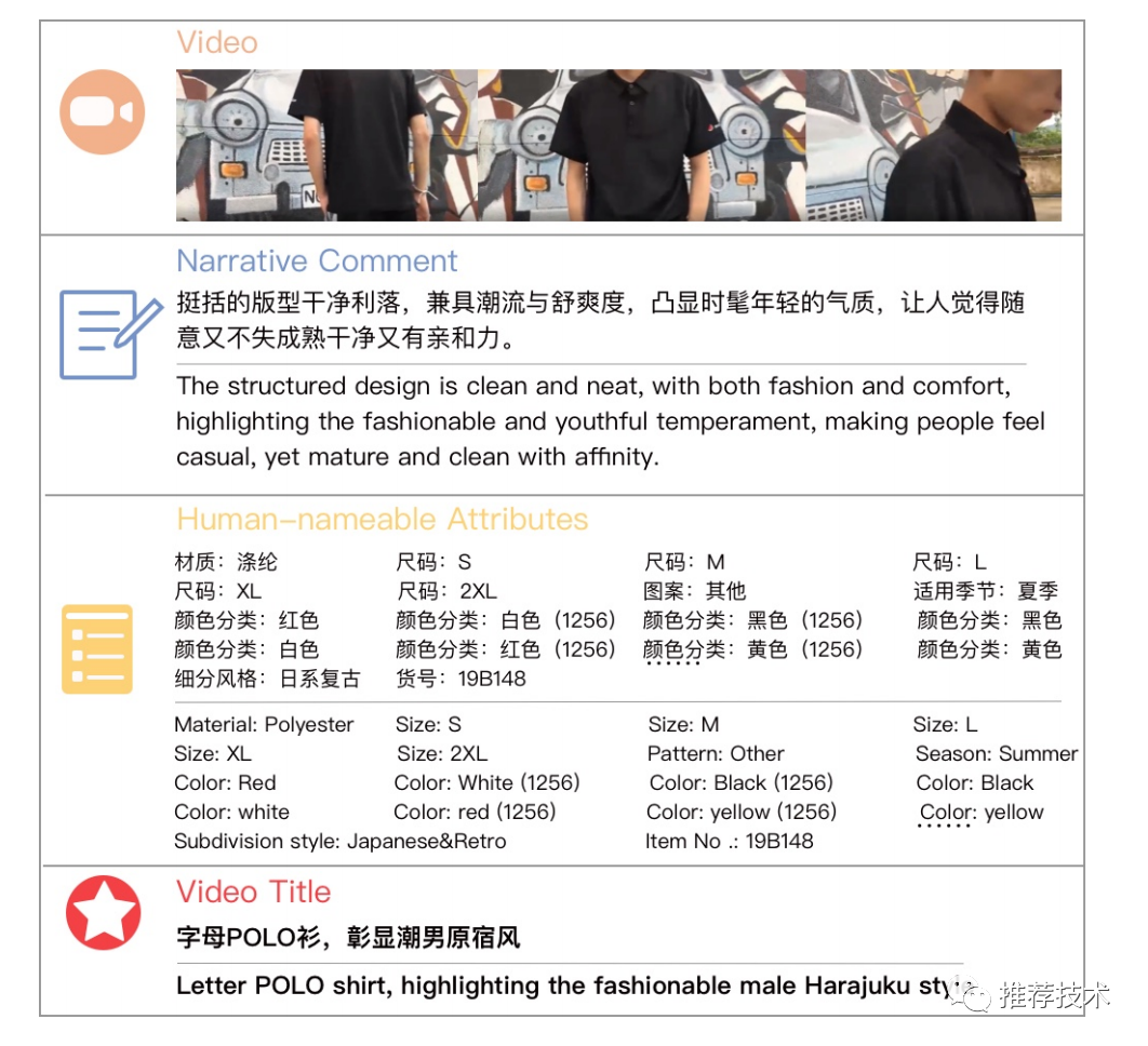 每个买家秀视频都会与一个特定的商品关联,而每个商品也都有属性信息,属性信息一般都是准确的。文中从淘宝的日志中获取了9w的数据集,大公司的豪气又一次显露无疑。