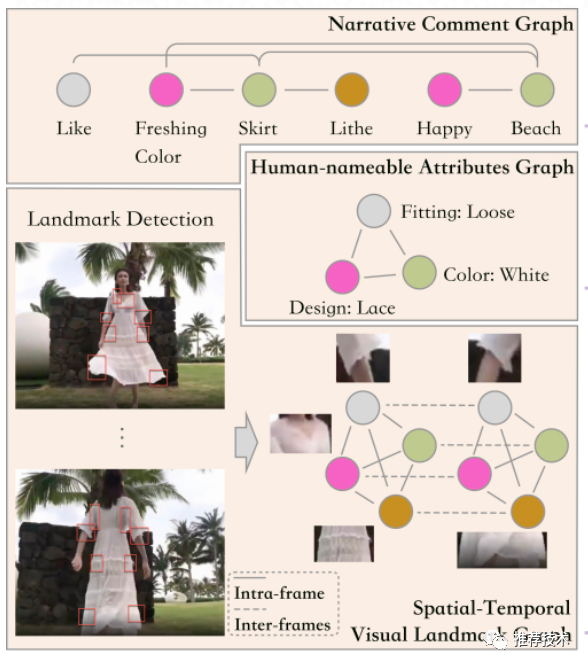 文中用了另一篇文章里检测衣服类商品部位特征的方法(Landmark Detection技术),每一帧的每一个部位都是图节点,在上图用红色框框标出。同帧的部位节点全连接,不同帧的相同部位节点全连接,前者有利于捕捉同一帧里商品部位间的交互,后者有利于捕捉同一个商品部位随着时间线的动态变化。