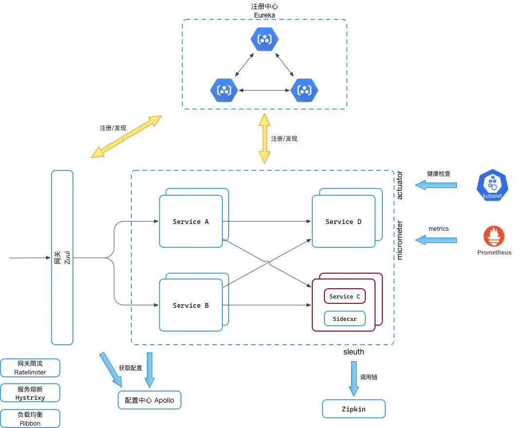 边车 Sidecar:集成了服务注册和发现,以及 Zuul 用于实现跨语言的微服务调用