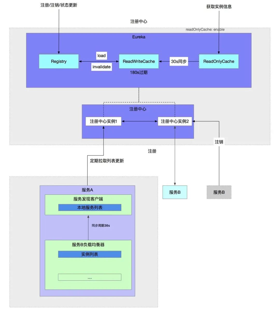 使用默认配置的情况下,实例正常上、下线的被发现延迟最大为 90s ,比如,服务 B(提供方)的一个实例上 / 下线,服务 A(调用方)在最长 90s 之后才会发现。这与 Netflix 的设计有关: