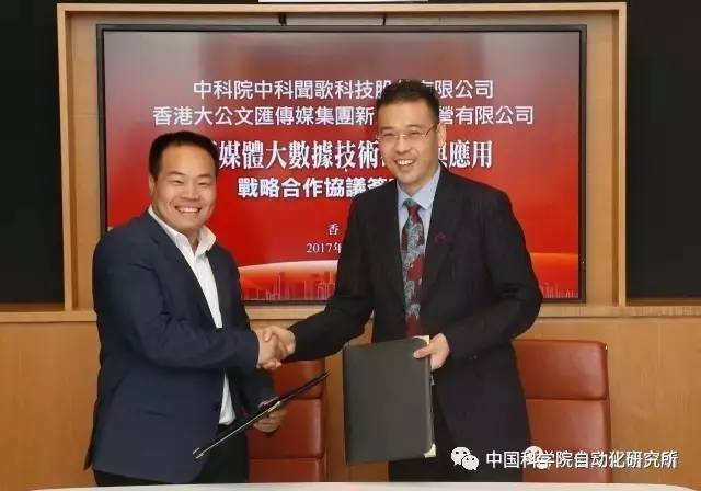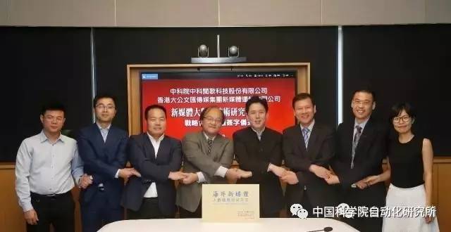 8月4日,为加快传统媒体和新兴媒体融合发展,提升媒体传播力和竞争力,中国科学院自动化研究所与香港大公文汇传媒集团签署合作备忘录,双方拟就新媒体大数据理论研究、全媒体大数据、新媒体大数据与人工智能成果产业化应用,以及高层次技术人才培训四个方面展开合作。同时,香港大公文汇传媒集团新媒体运营有限公司与北京中科闻歌科技股份有限公司签署战略合作协议书,就新媒体大数据等相关业务共同成立“海外新媒体大数据应用研究室”,并开展专题研究及定期学术研讨交流等相关合作。