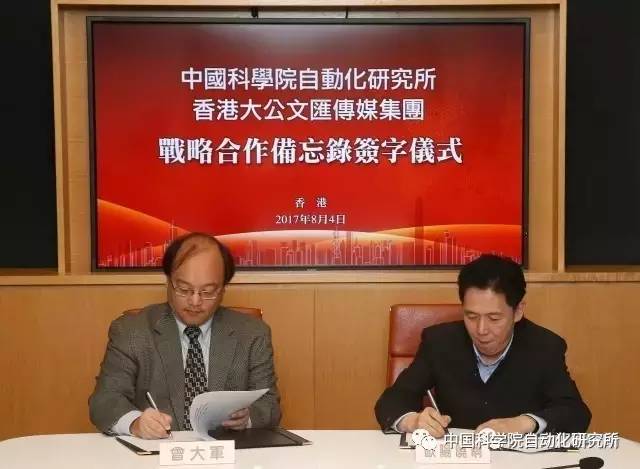 自动化所互联网大数据研究中心主任曾大军和香港大公文汇传媒集团副董事长兼总经理欧阳晓晴在港签署合作备忘录。中国科学院自动化研究所是新媒体大数据、人工智能技术的国家级科研院所。曾大军表示,这次合作将共同推进新媒体大数据技术研究与应用。