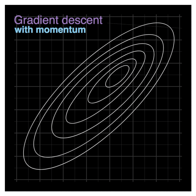 我们尝试想象下指数加权平均对模型行为的影响,再想象下成本函数的等高线。上图对比展示了标准梯度下降与动量梯度下降。我们可以看到成本函数图的形态使得优化非常缓慢。以股市价格为例,使用指数加权平均使得算法专注于未来走势而非噪声。最小值分量被放大,振荡分量逐渐消失。此外,如果后续更新过程中所得梯度指向类似方向,则学习率将增加,进而实现更快收敛并减少振荡。然而,动量梯度下降的不足之处在于,每当临近最小点,动量就会增加。如果动量增加过大,算法将无法停在正确位置。