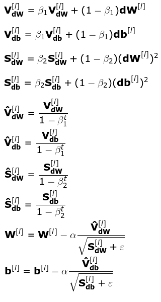 不幸的是,随着优化方法有效性的提高,计算复杂度也会增加。上面列了 10 个描述优化过程单次迭代的矩阵公式。我知道那些数学基础薄弱的读者情绪肯定不高。但是不要担心,它们并不是什么新内容。这里的公式和前文给出的动量梯度下降和 RMSProp 一样。不过这里我们需要一次性运用这两个策略的思路。