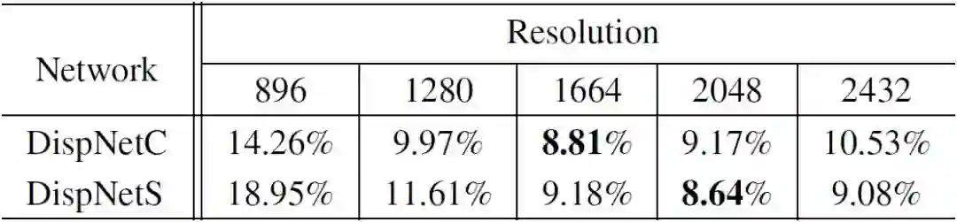 导致该现象的原因是,将输入图像放大等价于让立体匹配算法在亚像素的精度下进行匹配(更高的颗粒度),于是能产生更多的高频细节;然而,神经网络等价的感受野也会相应变小,换句话说,网络变得相对“短视”了,因此当r达到一定数值后,匹配精度开始变差。