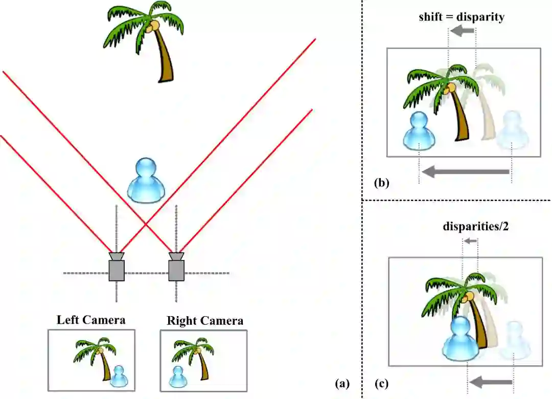 双目立体匹配是计算机视觉中的经典问题:给定一组校准好的双目视图(主图与辅图),立体匹配旨在寻找主图每一像素在辅图中的对应点并得到对应的视差,从而估计视图中所有像素的深度信息(如图1所示)。