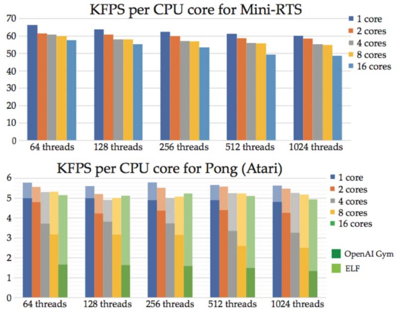 在 FAIR 早期的实验中,ELF 能进行更快的模拟,使用同样数量的 CPU 和 GPU 相比于 OpenAI Gym 玩 Atari 游戏可以提高 30% 的训练速度。当增加更多的核心之后,ELF 每核的帧率保持稳定。
