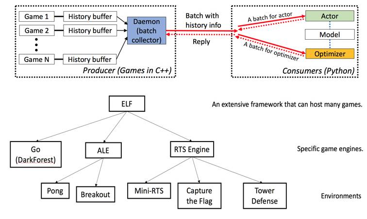 与其他在一个界面包含单个游戏的 AI 平台不同,ELF 能把一批游戏包括进一个 Python 界面。这使得模型和强化学习算法能够在每次迭代中包含一批游戏状态,降低了训练模型所需的时间。
