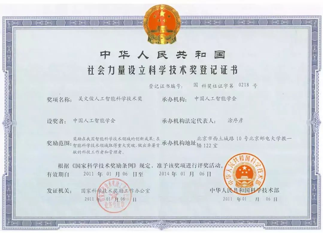 “吴文俊人工智能科学技术奖”由中国人工智能学会发起主办,2011年1月6日正式设立,以享誉海内外的杰出科学家、数学大师、人工智能先驱、中国智能科学研究的开拓者和领军人、首届国家最高科学技术奖获得者、中国科学院院士、中国人工智能学会名誉理事长吴文俊(1919年5月12日-2017年5月7日)先生命名,依托社会力量设立的科学技术奖,具备提名推荐国家科学技术奖资格,被誉为“中国智能科学技术最高奖”,代表人工智能领域的最高荣誉象征。