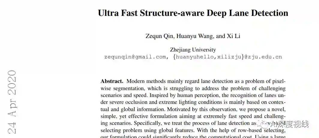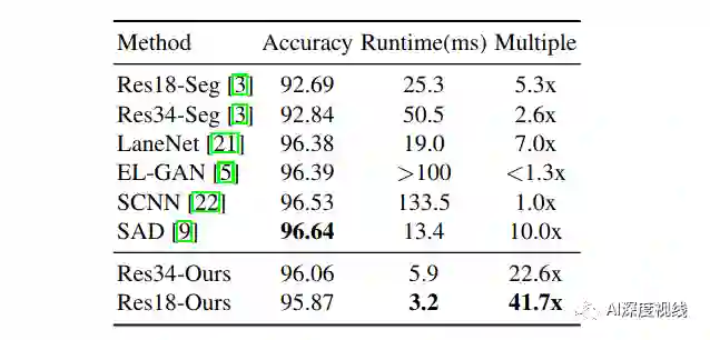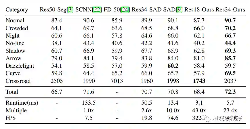 所提出的方法在具有挑战性的CU Lane数据集上,在准确性和速度方面都达到了最先进的性能。我们的方法的轻量级版本甚至可以达到300+ FPS,在相同的分辨率下,性能也相当,这至少比以前最先进的方法快4倍。