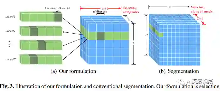 假设图像大小为H×W。一般来说,预定义的行锚和网格大小的数量远少于一个图像的大小,也就是说,h《h和w《w。这样,原始的分割需要进行h×w、 是C+1维的分类,而我们公式只需要解决C×h分类,是(w+1)维。通过这种方式,可以减少很大的计算规模,例如,使用的常见设置CULanedataset,理想的计算成本的方法是1.7×10^4的flops,一个用于分割的是9.2×10^5flops。计算成本大大降低,因此可以达到非常快的速度。