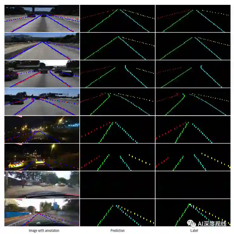 另一个显著的优点是,这种公式以基于行的方式对车道位置进行建模,使得有机会明确地建立不同行的关系。原有的由低水平的像素级建模和高水平的车道长线结构造成的语义鸿沟可以得到缓解。