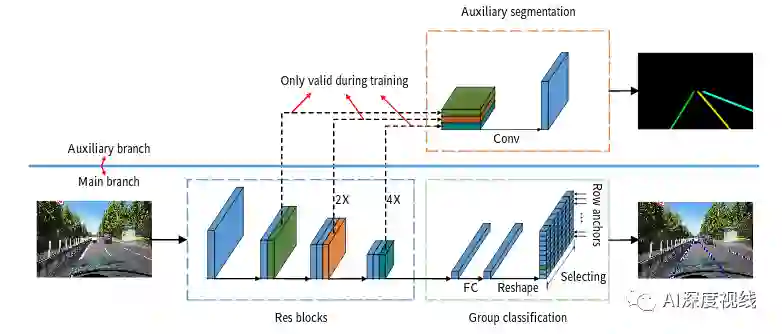 辅助分支显示在上半部分,只有在训练时才有效。特征提取器显示在蓝色框中。基于分类的预测和辅助分割任务分别显示在绿色和橙色框中。对每个行锚进行分组分类。