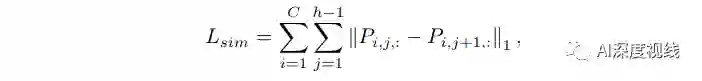 第一个是由车道是连续的事实推导出来的,也就是说,相邻行锚的车道点应该相互靠近。在本文的公式中,车道的位置由一个分类向量表示。通过约束分类向量在相邻行锚上的分布来实现连续特性。这样,相似度损失函数可以为: