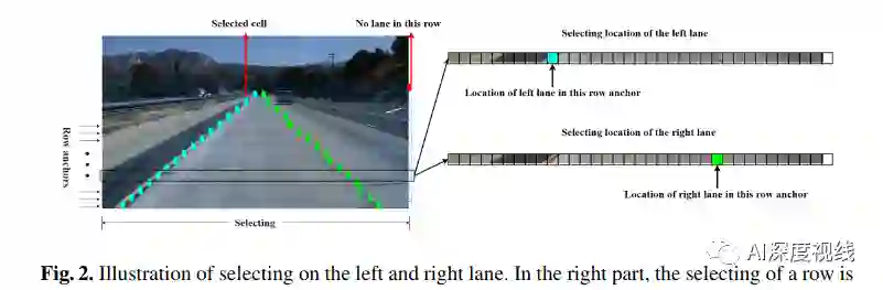 在右边的部分,详细显示了一行的选择。行锚是预定义的行位置,我们的公式定义为水平地选择每个行锚。在图像的右侧,引入了一个背景网格单元来表示该行中没有车道。