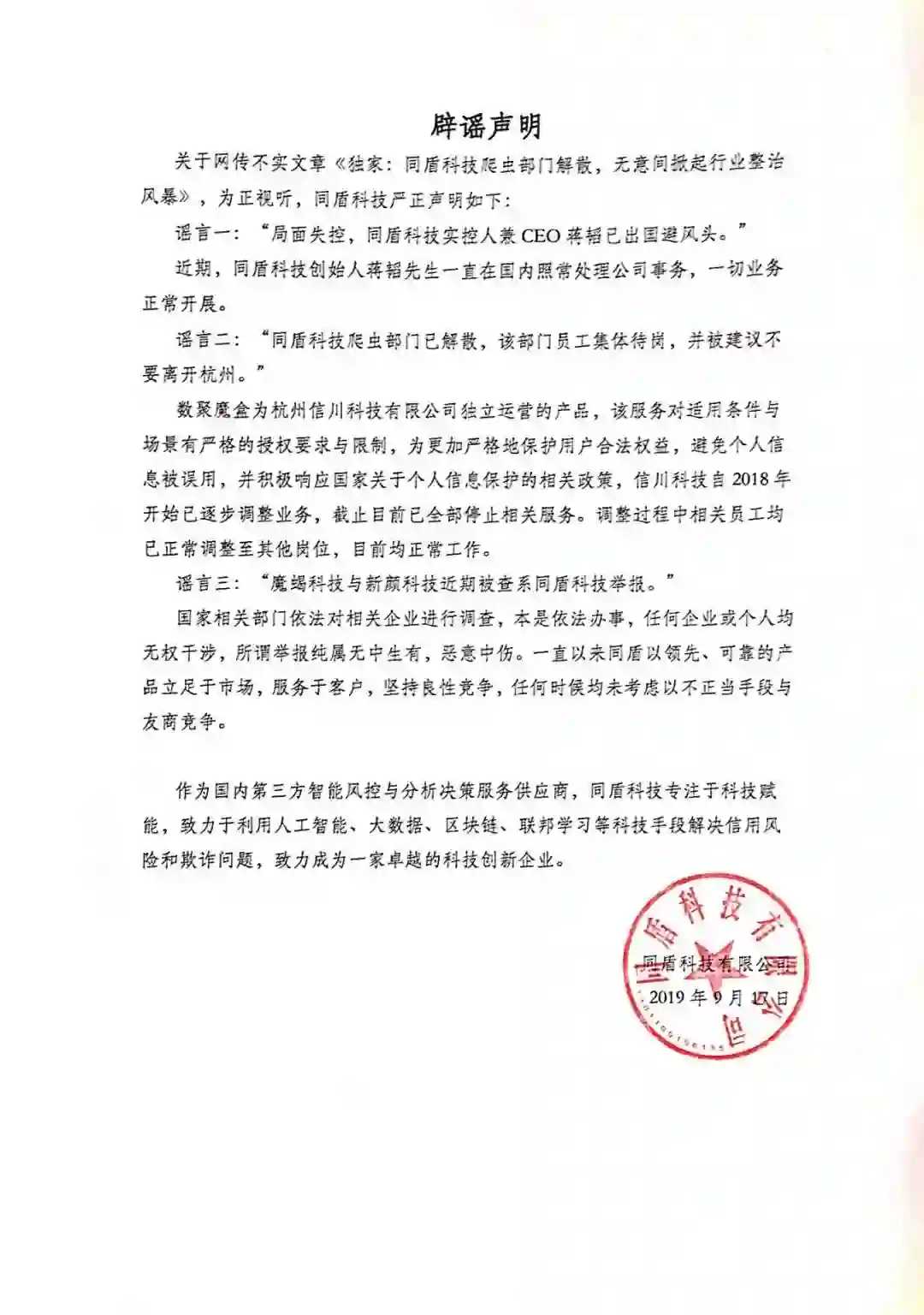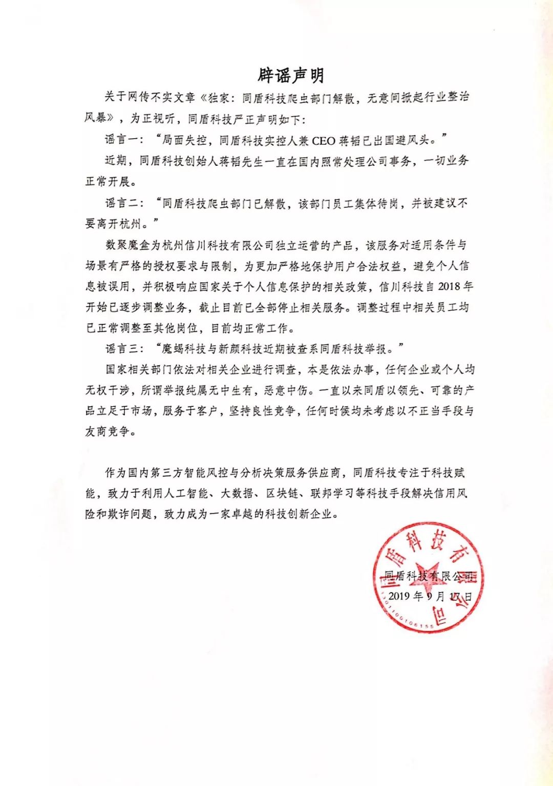 【附录一】同盾科技官方《辟谣声明》,内容如下: