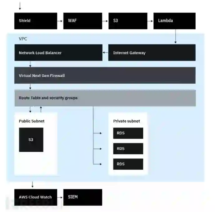 接下来,请求被发送到vpc路由表。路由表应用安全组策略,这些策略限制通信源、目标、端口和路由,以确保只有特定的服务可以通信。此路由表还区分了公共子网(即,ec2应用服务器,外部可访问)和私有子网(即数据库)。vpc完成的所有处理都被捕获在vpc流日志中,并存储到SIEM系统,SIEM系统很可能托管在本地或其他地方。