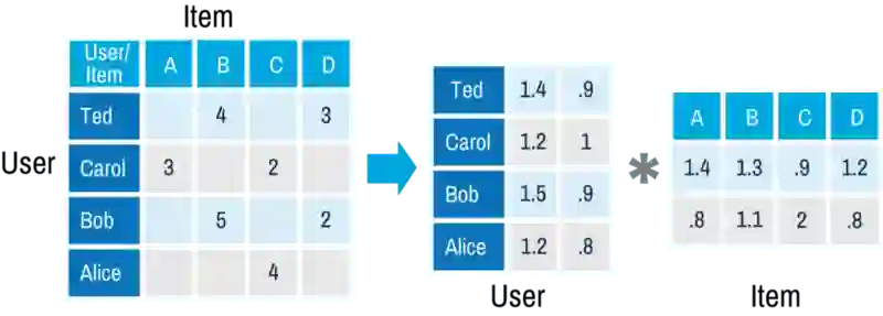 下一个有趣的算法是矩阵分解。这是一个非常优雅的推荐算法,因为使用矩阵分解时通常不用考虑要在结果矩阵的列和行中保留的物品。