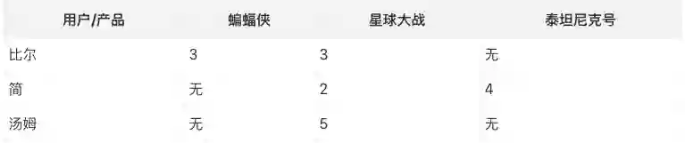 例如,如果我们想比较比尔和简,我们可以看到,比尔还没有看过《泰坦尼克号》,而简到现在为止还没看过《蝙蝠侠》,所以我们只能通过《星球大战》来衡量他们的相似性。怎么会有人不看《星球大战》,是吧?:)