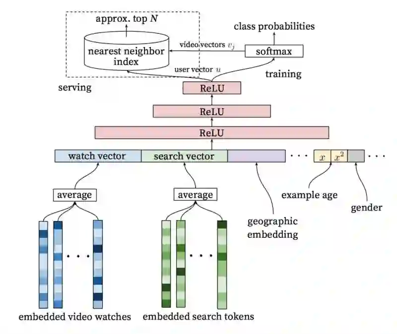 使用这一两步方法,我们可以基于一个非常巨大的视频语料库推荐视频,同时保证推荐的少量视频是个性化的。这一设计也允许我们混合从其他来源生成的候选视频。
