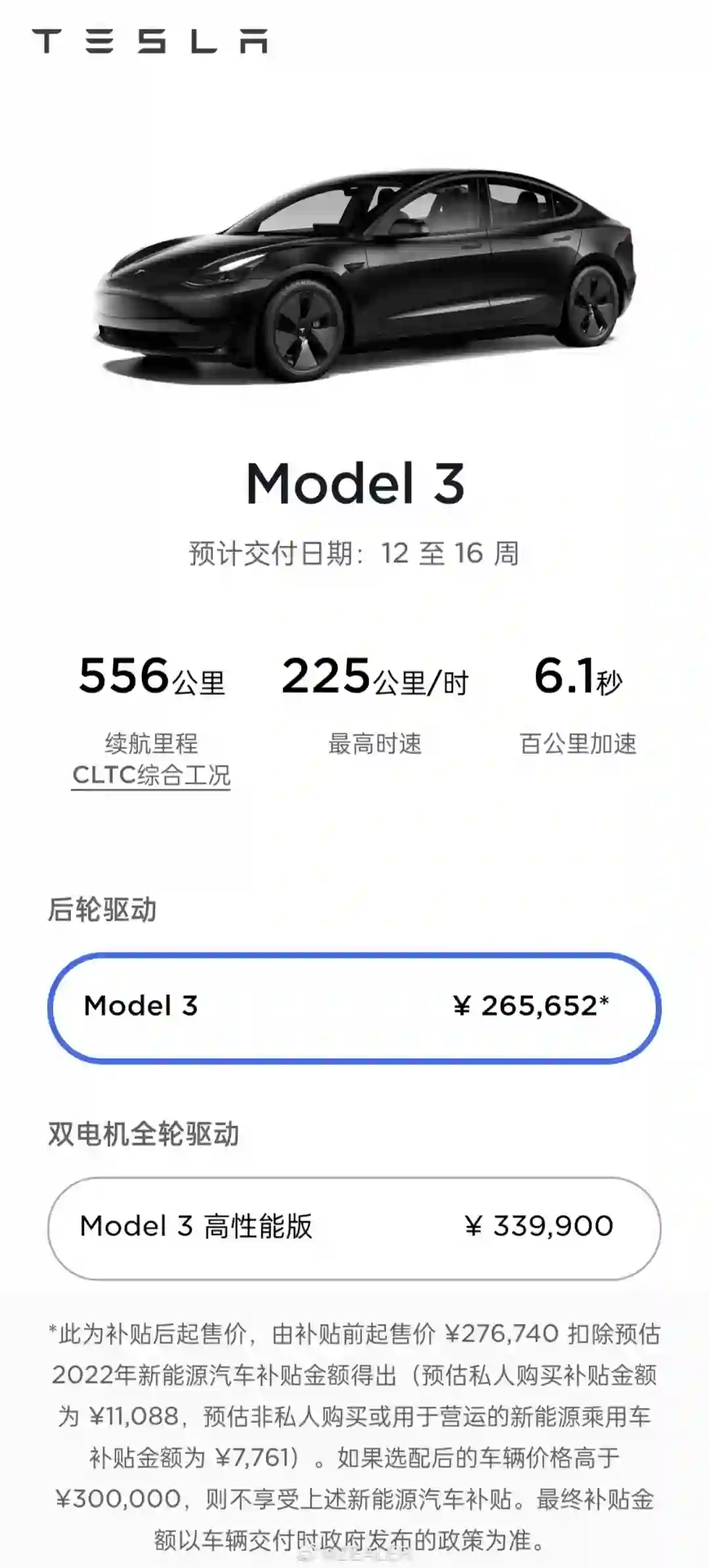 根据特斯拉官网显示,Model 3 和 Model Y 后轮驱动版本分别涨价 1 万元和 2.1 万元。由于涨价后的 Model Y 总金额已经高于 30 万元的新能源补贴线,因此该车型无法享受相关补贴。特斯拉此举或许是受到电子元器件短缺导致的涨价和订单过多导致的,目前特斯拉官网显示新下单的 Model 3 和 Model Y 交付时间都达到了 12-16 周。