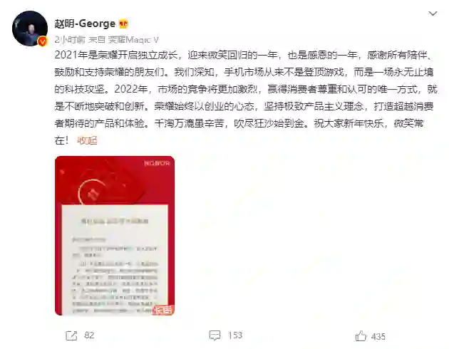 荣耀 CEO 赵明今日在微博发表总结信,他表示,荣耀首款折叠屏旗舰 Magic V 将在 2022 年 1 月和大家见面。手机将在形态、性能和交互三个维度,实现革命性的突破。此外,手机将搭载荣耀自研,行业最薄铰链专利技术,为消费者提供最实用的折叠屏解决方案。官方在文中透露,荣耀 Magic UI 6.0 系统也将随 Magic V 一同发布。荣耀将由此起步,以打造比肩和超越 iOS 的体验和产品作为奋斗目标。