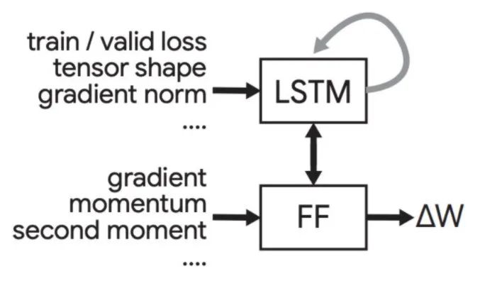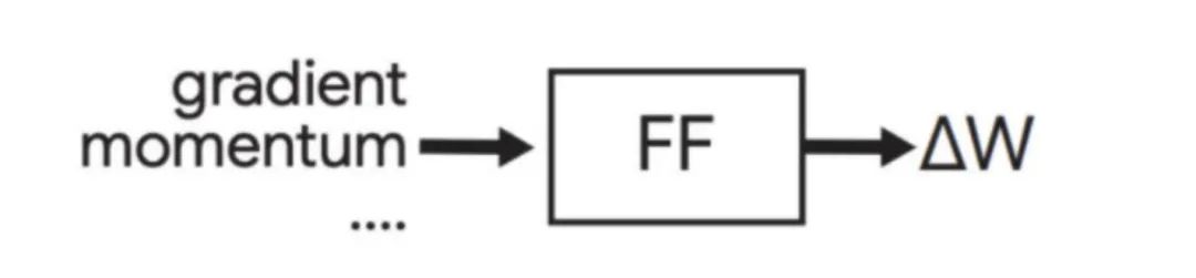 上图的优化器结构是ICML2019上提出的,使用了一个全连接网络(Feed-Forward,FF)。当模型完成了一个step的训练后,就用这个FF对每个参数进行更新。FF的输入端是模型某个参数 的梯度,以及该参数的其他feature(如Momentum等)。FF的输出端是w的更新值 ,则该参数将被更新为 。注意,这个FF每跑一次,只完成了一个参数的更新。