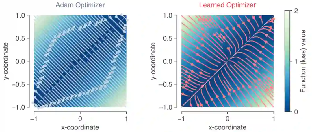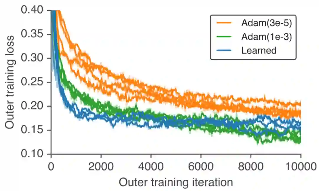 在机器学习中,时常会在目标函数中加入正则化惩罚项,从而对模型的复杂度进行规约。下图展示了Adam和learned optimizer在优化目标函数 时的收敛轨迹。显然直线 上目标函数最小。但可以看到Adam会直接垂直地收敛到 上。而learned optimizer在收敛过程中还会有逐渐接近原点的趋势。作者认为这是由于接近原点处的(x,y)范数较小,表明learned optimizer有隐式地进行正则化规约。