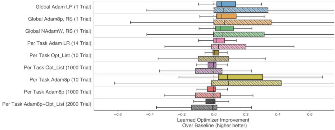 纵轴代表了不同设置下的三个basline优化器。最上面3个Global XXX的设定是:该baseline优化器对于所有任务都采用相同的超参数。而下面6个Per Task XXX对不同任务可以采用不同超参数,括号中的XXX Trial代表尝试调参的轮数。每一种baseline,都对应了两条同色系的箱图。这是因为用于测试的100个测试任务中,有一部分是learned optimer训练过程中见过的,有一部分从未见过。同色系的两个箱图中,上面那条代表在见过的那些任务上的提升效果,另一条代表在从未见过的那部分任务上的提升效果。