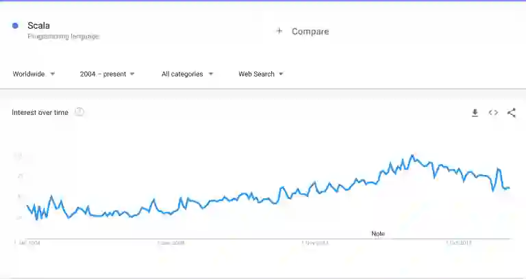 举例来说,我们看一下 Scala 语言,自 2009 年以来,Scala 变得越来越受欢迎,开发人员欢迎这种新的函数式风格,它能够让他们的编码更灵活,也能安全轻松地编写出并行代码。我们可以在下面的谷歌趋势图中看到这个趋势: