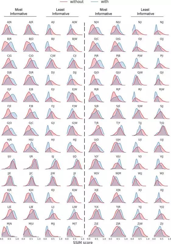通过这种新颖的字形堆栈设计,神经网络可通过通道信息获得不同字形之间的相互关系,从而实现自动风格迁移。如下图所示,揭示了模型如何从 1500 个字形样本中学到相关性,并经结构相似性(SSIM)标准进行量化。一次只需观察一个字母,就可找到 25 个分布。这些图显示了当字母β被观察到时(蓝色)与其他字母而不是β被给出(红色)时生成字母α的分布α|β。图中显示了两个信息最丰富的给定字母的分布和两个最不明显的信息,分别用于生成 26 个字母。例如,从图中的第五行可知,字母 F 和 B 在生成字母 E 时最有建设性,与其他字母相比较,而 I 和 W 是包含信息量最少的字母。另外,O 和 C 是用于构造 G 以及用于生成 P 的 R 和 B 的最具建设性意义的字母。