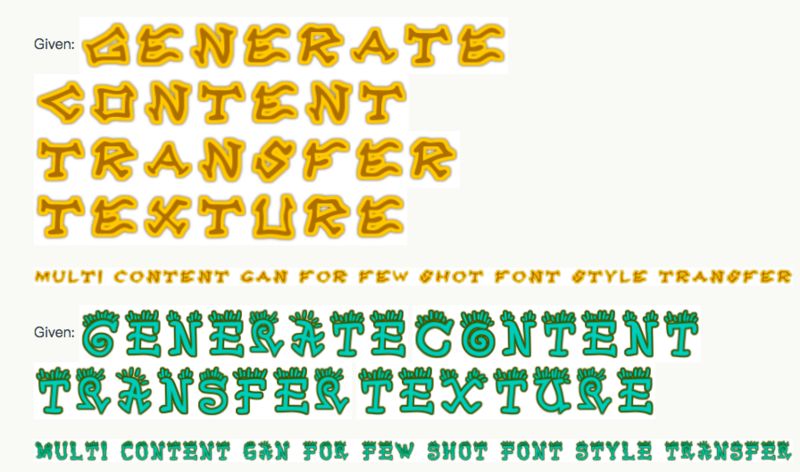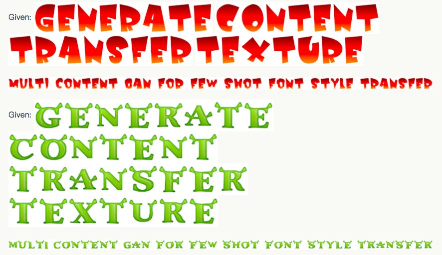 [2] Samaneh Azadi, Matthew Fisher, Vladimir Kim, Zhaowen Wang, Eli Shechtman, and Trevor Darrell. "Multi-Content GAN for Few-Shot Font Style Transfer." CVPR 2018.