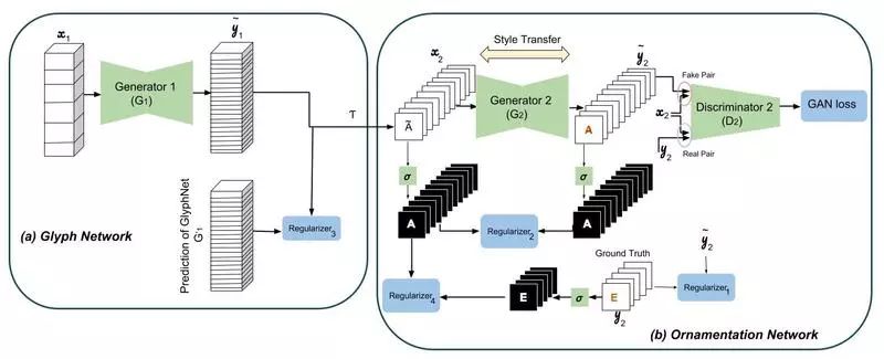 多内容 GAN 模型由多个 cGAN 堆叠组成,其中一个 cGAN 用来预测粗略的字形形状,一个 cGAN 用来预测字形最终的颜色和纹理。第一个网络称为 GlyphNet,预测字形蒙版;第二个网络称为 OrnaNet,用来对第一个网络生成的字形进行着色和装饰。每个子网络都遵循 cGAN 的体系架构,其中部分架构会因实现预测字形或装饰等目的而微调。