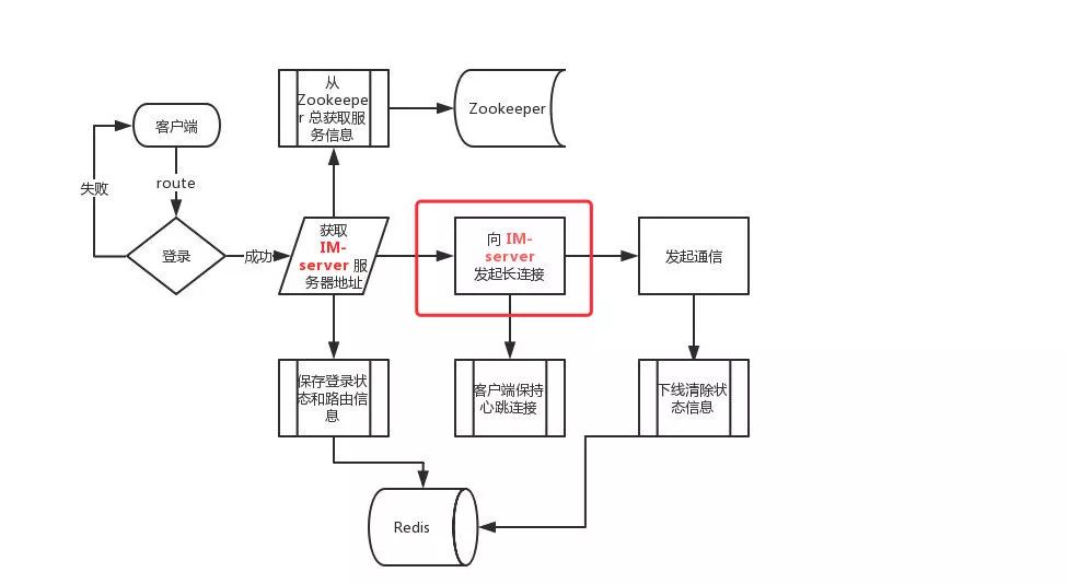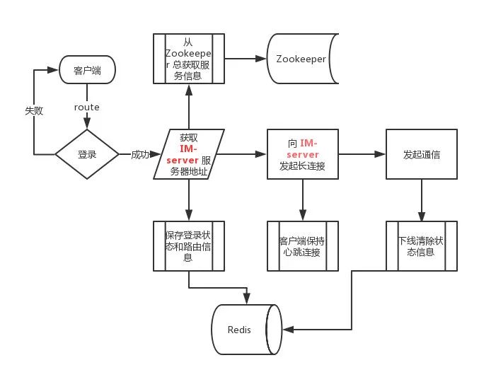 登录成功从 Zookeeper 中选择可用 im-server 返回给客户端,并保存登录、路由信息到 Redis。
