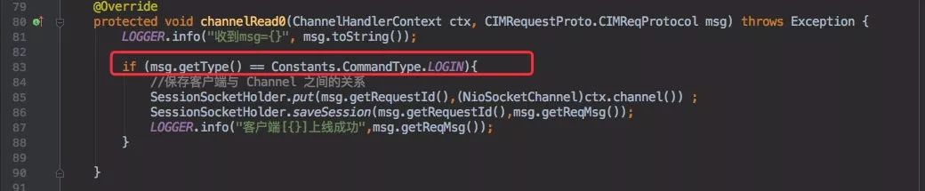 这时客户端会发送一个特殊报文,表明当前是登录信息。服务端收到后就需要将该客户端的 userID 和当前 Channel 通道关系保存起来。