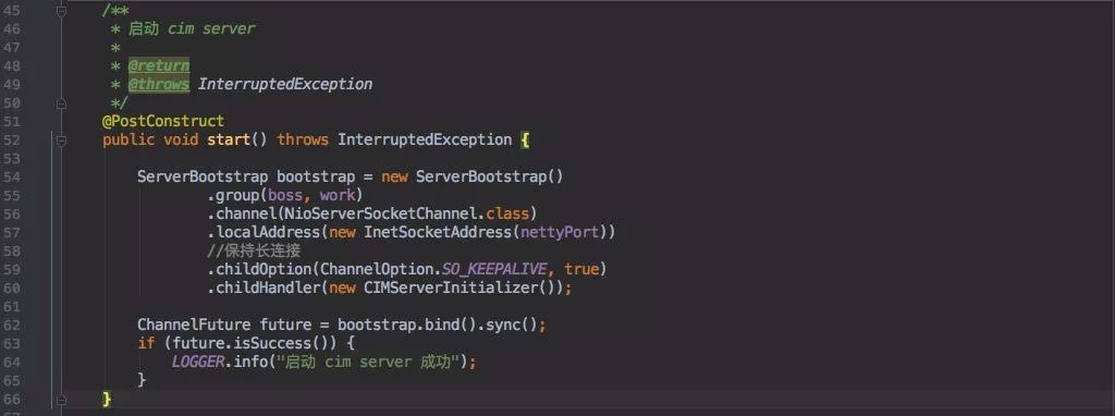 由于是在 Spring Boot 中搭建的,所以在应用启动时需要启动 Netty 服务。
