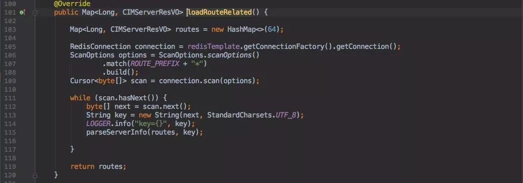 由于 Redis 单线程的特质,当数据量大时;一旦使用 Keys 匹配所有 cim-route:* 数据,会导致 Redis 不能处理其他请求。