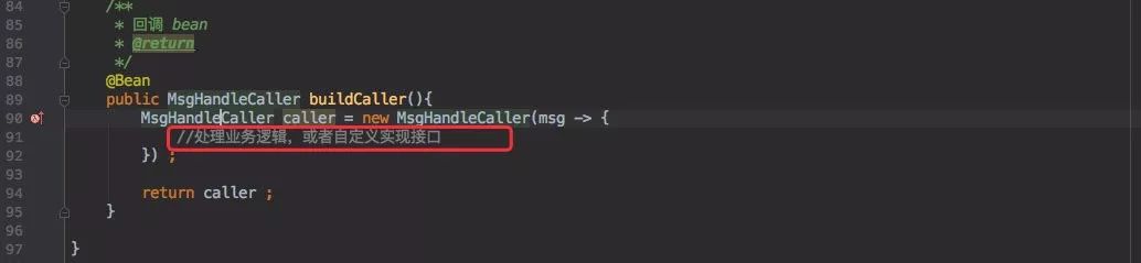 因此先创建了一个 Caller 的 Bean,这个 Bean 中包含了一个 CustomMsgHandleListener 接口,需要自行处理只需要实现此接口即可。