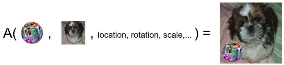 图 2:patch 应用算子的图示。该算子以 patch、图像、位置和任意的 patch 变换(例如,比例和旋转)为输入,并将变换后的 patch 放到图像的给定位置上。然后该 patch 被训练以优化目标类的期望概率,其中期望值对任意随机的图像、位置和变换都是稳定的。