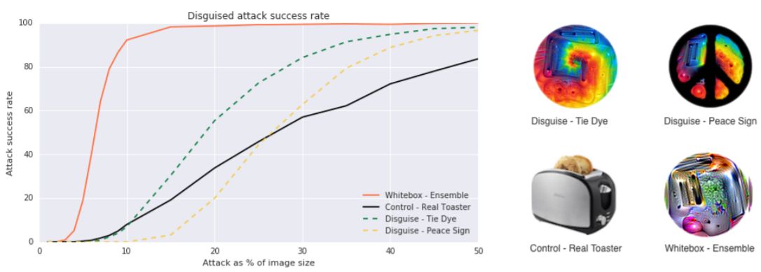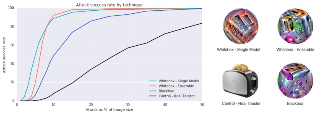图 3:各种创建对抗 patch 方法的对比。注意这些成功率是按 patch 位于图像上的随机位置测量的。图中的每个点都是通过将 patch 应用到 400 张随机选择的图像的随机位置而计算的。图中测量了不同图像面积占比的的对抗成功率,每个比例都是在 400 张图像上独立地测试的。