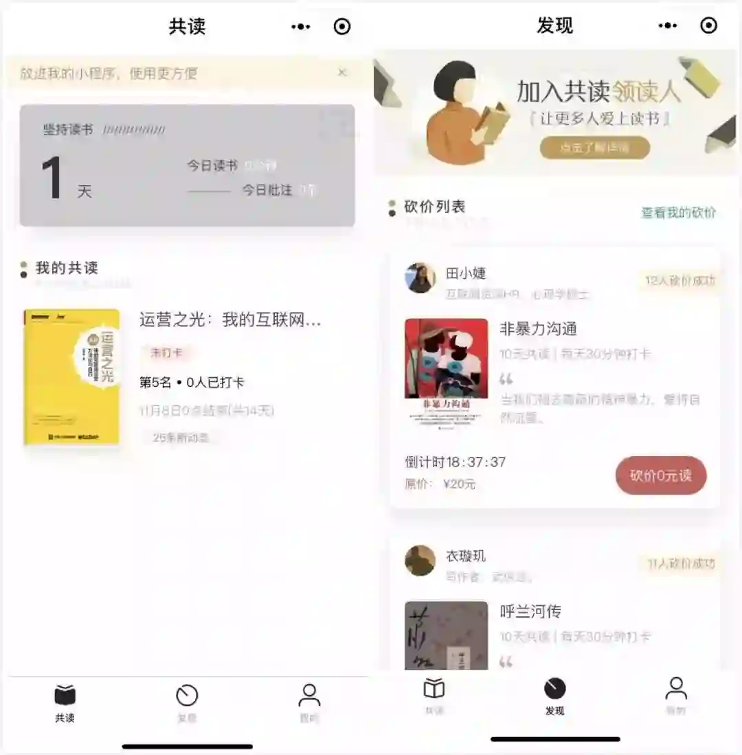 相较于App版本的核心亮点KOL领读功能,小程序则更突出“领读人的共读模式”,即邀请好友砍价免费获得电子书后,与多人同时阅读,并看到领读人和共读好友的批注及讨论。