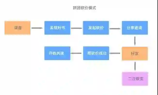 在流量获取上,拼多多、小游戏做了许多裂变活动,蜗牛共读也尝试用“砍价”模式拉动用户增长,用户看到自己想要阅读的书后,可以邀请好友帮助砍价,砍价金额随机,砍到0元即可免费阅读,“拼砍价”具有很强的社交属性,基于微信熟人关系链,抓住用户“贪”和“帮助”的心理完成快速的用户增长。