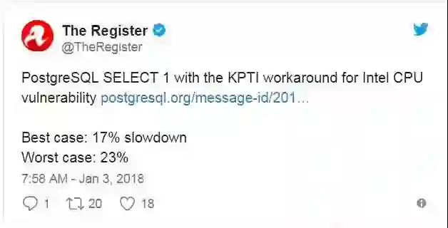 此外,由于漏洞是硬件设计导致的,无法使用微码修复,只能进行 OS 级的修复,而 OS 级的修复会导致严重的性能问题,可能会有 5%-30% 的性能下降。有网站对此事进行了初步测试,证实一些 CPU 执行 IO 密集型任务的速度下降了 18%,不过 Linux 下的游戏性能没有受到影响。