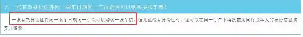 在 12306 官方网站上,明确写道:一个有效身份证件同一乘车日期同一车次可购一张车票(但使用同行成年人的有效身份证件信息为乘车儿童购买儿童票的除外)。