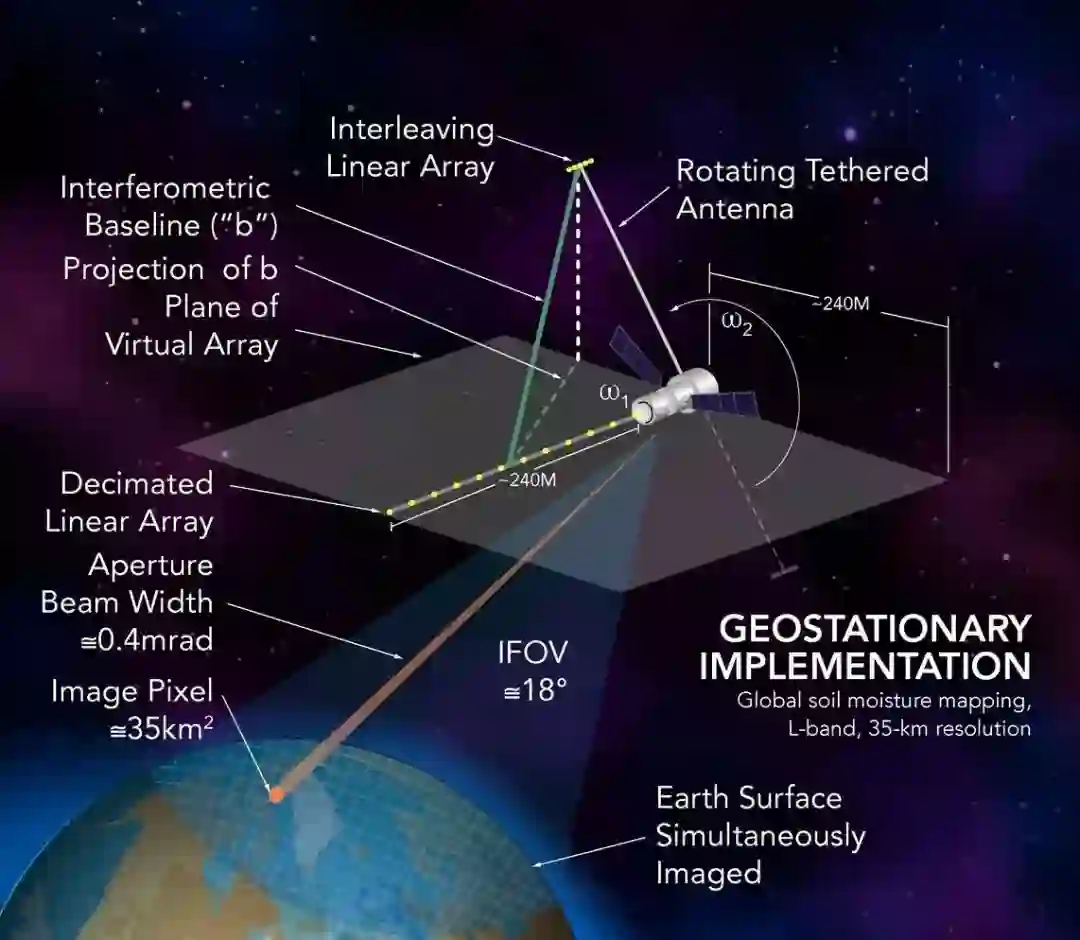 旋转式运动扩展合成阵列(R-MXAS)是一款具有革新性的合成孔径成像辐射计,可用于对地球进行高分辨率观测。在设计上,R-MXAS借助刚性系绳上的一个一维天线阵列以及一个或多个以一定角度环绕一维阵列的系绳天线进行观测。与当前的设计相比,这款新设计的个头更小、重量更轻并且能耗更低。